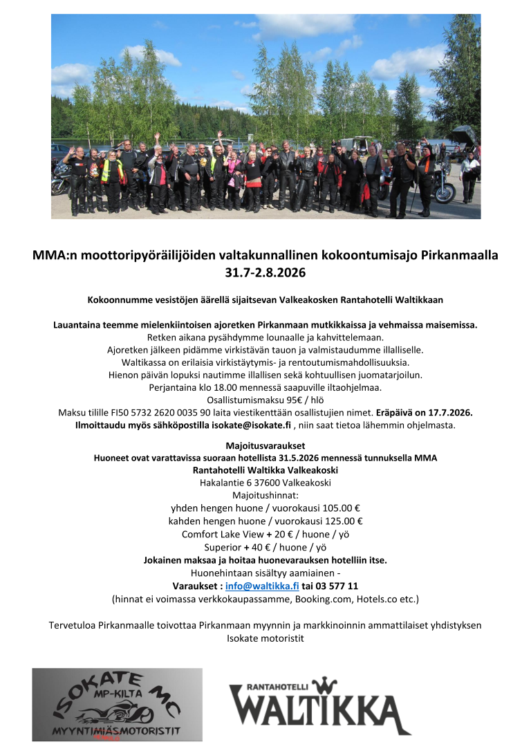 MMA:n moottoripyöräilijöiden valtakunnallinen kokoontumisajo Pirkanmaalla 31.7-2.8.2026